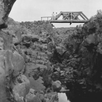 - "Rocky Gulch - Malad River;" two men in light duster coats stand behind an automobile (car) on a wood bridge spanning a narrow chasm.