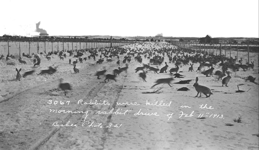 - "3067 Rabbits were killed in the morning rabbit drive of February 11, 1913;" rabbit drive, with hundreds of rabbits in the foreground being pushed down a lane by a large group of hunters in the background