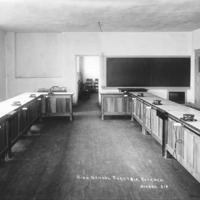 - "High School Electric Kitchen; a classroom with counters with elevated hot plates.