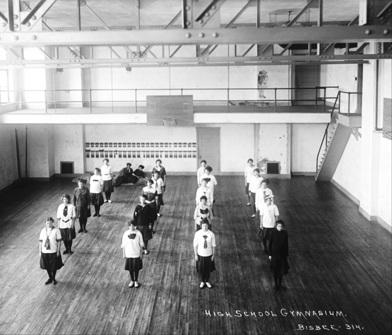 - "High School Gymnasium;" Twin Falls High School students in formation on the gymnasium floor, a couple sit on the floor in the back; staircase and mezzanine can be seen; basketball hoop and weights also visible