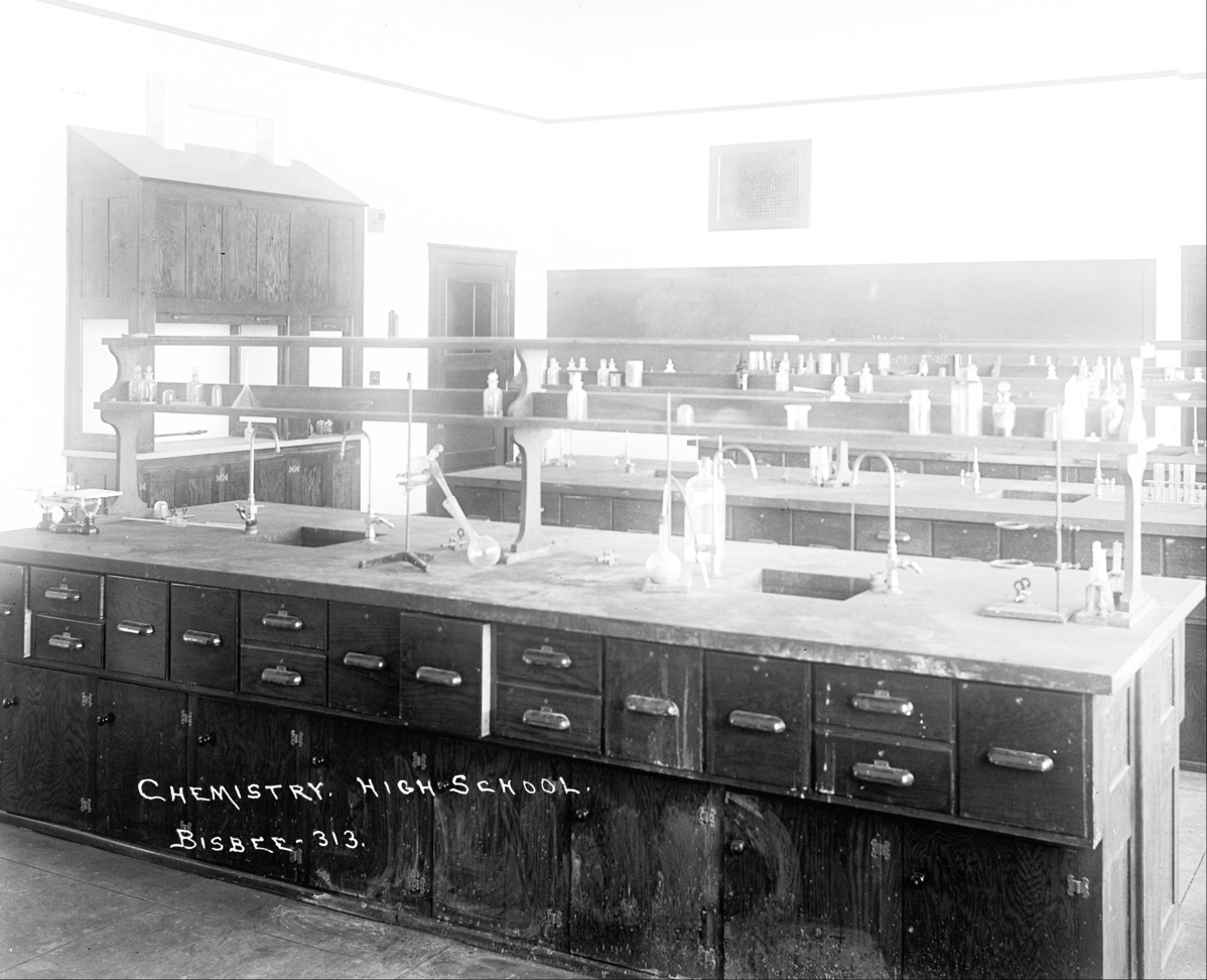- "Chemistry. High School;" empty Twin Falls High School classroom, with lab apparatus.
