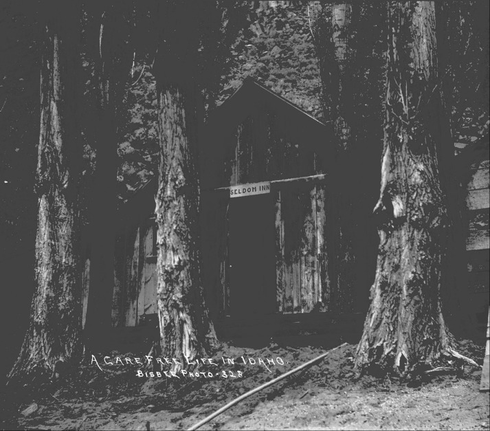 - "A Care Free Life in Idaho;" cabin tucked into trees beneath a rocky wall, with a sign above the door that reads, "Seldom Inn;"
