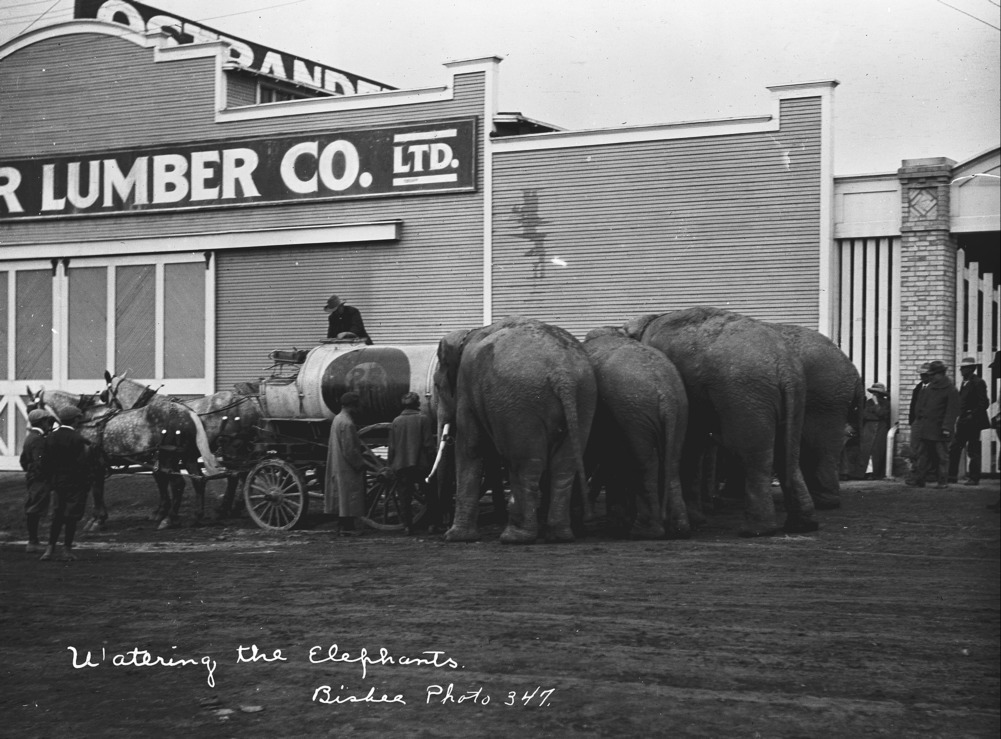 - "Watering the Elephants;" four elephants being watered with a horse-drawn tank in front of the Ostrander Lumber Company; several men look on.