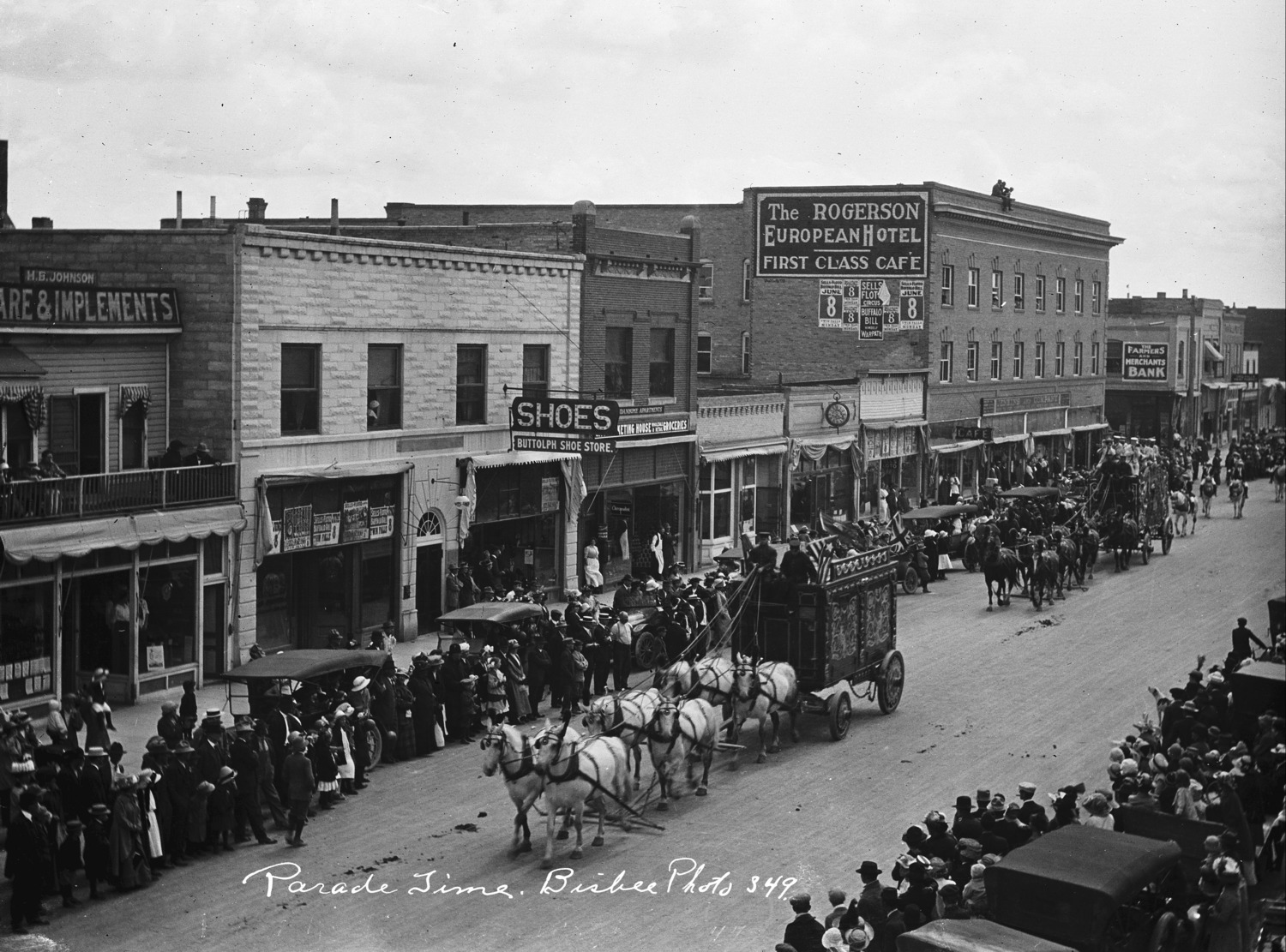 "Parade Time;" circus parade through downtown Twin Falls, Idaho. Crowds of people line the sidewalks. Visble businesses and buildings include: H. B. johnson Hardware and Implements; Buttolph Shoe Store; Idanhome Apartments; Marketing House Wholesale and Retail Groceries; Chiropodist; Cafe; Jenkins and Company; Rogerson Hotel; Farmers and Merchants Bank;