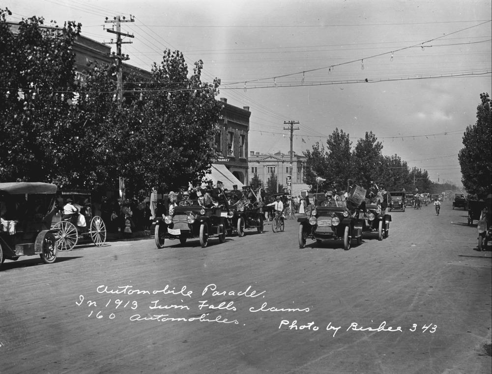 - "Automobile Parade. In 1913, Twin Falls claims 160 Automobiles;" parade on Shoshone Street, Twin Falls County Court House in background; automobiles (cars) carrying band and musical instruments have signs with "Member of Twin Falls Commercial Club; also visible is the Lyric Theater.