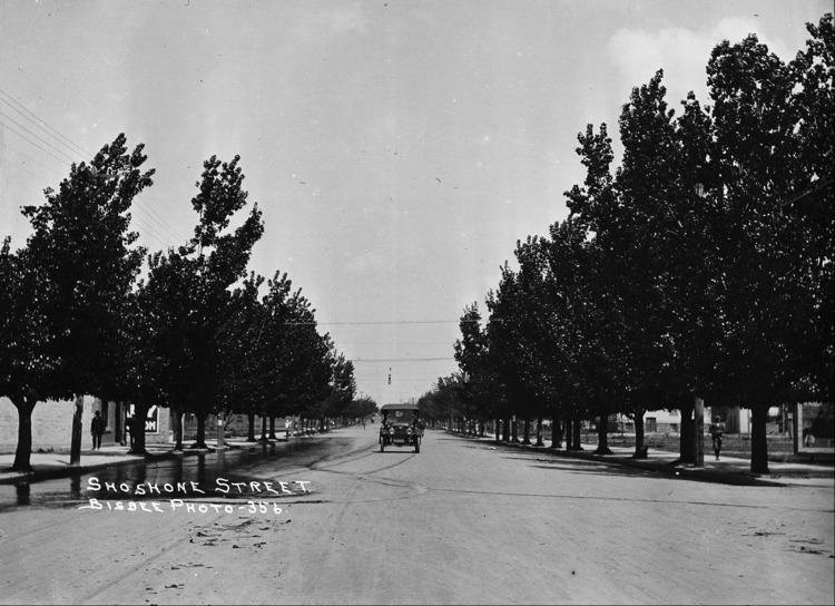 - "Shoshone Street;' an automobile (car) drives down the center of the street lined with trees.The Methodist Church can be seen beneth the treeline on the right.