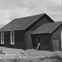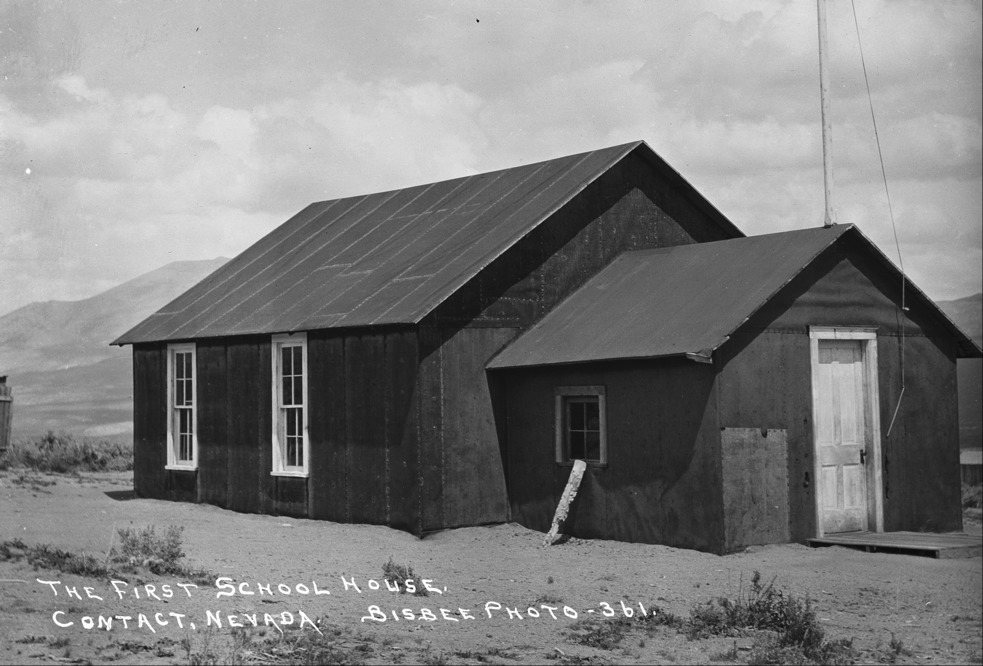 - "The First School House, Contact, Nevada;" a tarpaper-covered frame building.