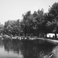 - Ducks float on a pond lined by trees and a few boats; a man stands near the boats; a building sits behind the trees.