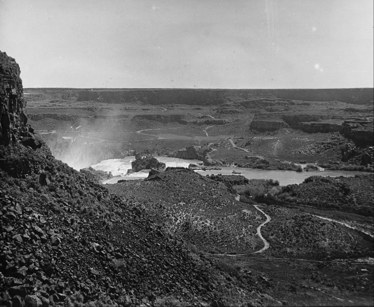 - A wide view of the Snake River Canyon above Shoshone Falls, looking north.