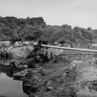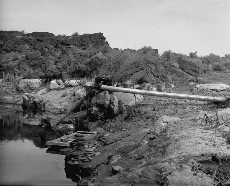 - A large pipe, a boat, and an old automobile (car) converted to a water pump near a pond in the Snake River Canyon.