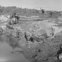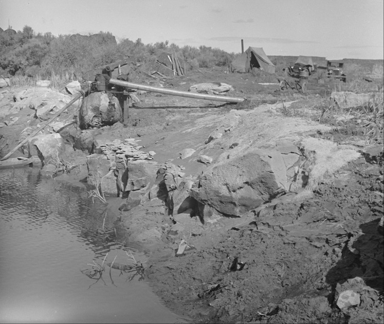 - A amn works on a pumping station in the Snake River Canyon; a tent and a couple of automobiles (cars) are in the background.