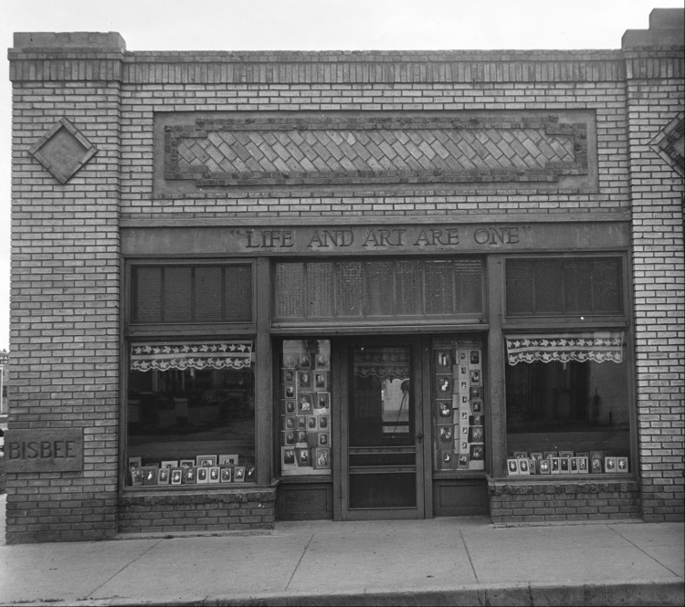 - The Bisbee Studio, with his motto, "Life and Art Are One" above the entrance. Portraits decorate the display windows.