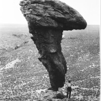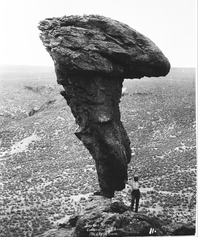 - "Balance Rock; Copyright 1908; Twin Falls, Idaho;" Clarence Bisbee standing at the base of Balanced Rock.
