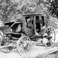- "Century old and Bullet-Scarred, A Pioneer of Idaho;" worn stagecoach stagecoach fastened to a wooden platform among trees.