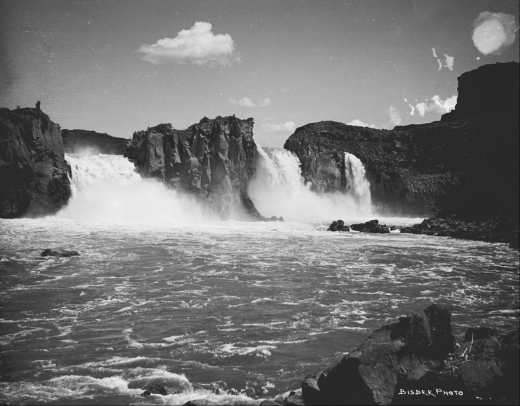 - The Twin Falls from the river level, showing all three falls.