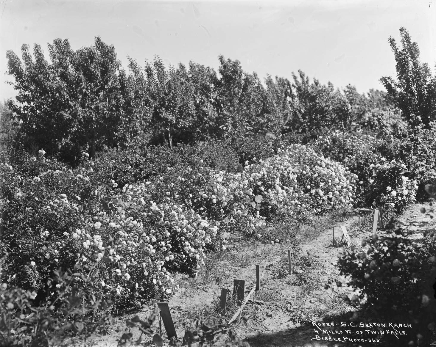 - "Roses - S.C. Sexton Ranch; 4 miles west of Twin Falls;" roses bushes among fruit trees.