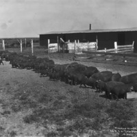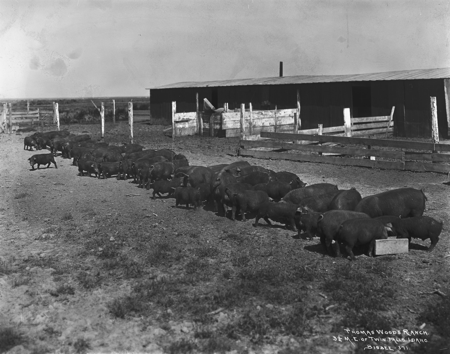- "Thomas Woods Ranch, 3 1/2 miles east of Twin Falls, Idaho;" pigs at trough near outbuildings.