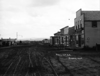 PC-2259 "Hollister;" buildings along the main street; Businesess and buildings visible include: restaurant, hotel, furniture, general store, general merchandise.