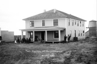 PC-2265 "The Hotel at Amsterdam;" square wooden frame building, with several people posing near porch in the front. Outbuildings in background.