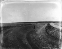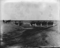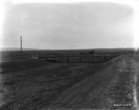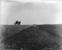 S 031 A man in a two-horse buggy stops on a berm beside a dry canal. Gates are in background.