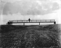 S 036 A man and a two-horse buggy stands on a low bridge over a dry canal.