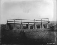 S 027 A man (possibly Clarence Bisbee) stands along concrete dam in a canal system.