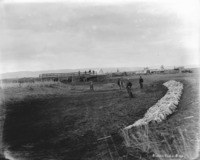 S 040 Several men stand in a shallow canal. Other men stand on a low bridge in the center background. Tents and outbuildings in a camp nearby.
