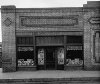 PC-2399 The Idaho State Employment Service Office to the right of the Bisbee Studio. (Sign also reads, "Effiliated with the Re-Employment Service;" a large sign holder with lights juts from above the entrance.