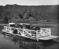 PC-2395 "Shoshone Falls Ferry;" two buggies and people travel on the ferry above Shoshone Falls.