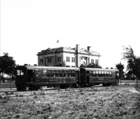 PC-2390 Two cars of the Twin Falls Electric Railway, parked behind the Twin Falls High School, with several men posing with the train.
