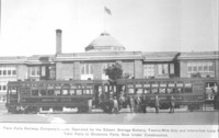 GB 084 "Twin Falls Railway Company's Cars, Operated by the Edison Storage Battery, Twelve-Mile City and Interurban Loop from Twin Falls to Shoshone Falls, Now Under Construction;" two of the Twin Falls Electric Railway (railroad) cars parked behind the High School.