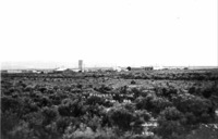 GB 005 "Hollister in 1912;" wide view of early Hollister across a sage brush plain, showing several buildings.