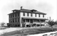 E 015 "State School for Deaf and Blind. Gooding, Idaho;" Two large stone buildings viewed from across a field. Students and other adults are posed on the steps of the larger buildings, while a group of men with wheelbarrows and other equipment work on the land between the buildings.