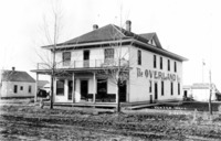 GB 002 "Hansen, Idaho;" the Overland Hotel, with a man on the porch and a child in the street. Other buildings in background are visible.