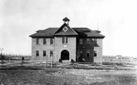 GB 007 "Hansen School;" a two-story brick school, with bell tower at top. A man stands in the yard at left, and the school is bordered with a wooden fence. A house and outbuildings visible in background.