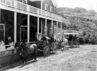 GB 006 "Stages at Shoshone Falls;" The Shoshone Falls Hotel (also known as Little Dewey House) with several people seated on the porch. A wagon and a covered buggy with horses and passengers are parked alongside the building.