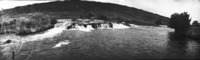 C 045 Panoramic view of a river flowing over a wide set of rocks at the bottom of a canyon
