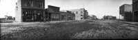 C 016 Panoramic view of Main Ave, looking south. The shadow of Clarence Bisbee and his camera can be seen near the bottom of the photo. Businesses and buildings visible include: McCornick and Co Bank; The Liberal Cigar Store, Boyd building, Perrine and Burton Merchandise; Hotel Perrine; Eldridge's Clothing Store;