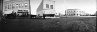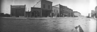 C 014 Panoramic view of Main Ave, looking east; Businesses and buildings visible include: Peoples's Drug Store, Eldridge's Clothing Store; First National Bank; Young's Grocery
