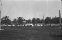 C 004 People gather around the edges of the park near the maypoles on May Day in Twin Falls City Park. Several houses can be seen in the background.