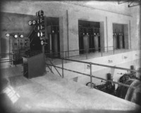B 143 "Head Gates, North Side;" a man stands on a rock wall leading to several canal gates