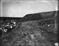 B 108 "Ditch Camp. North Side;" wide view of construction camp, with several tents and outbuildings among the sage brush. Several teams of horses at work on the left.