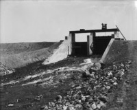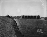 B 102 "Head Gates at Wilson's Lake;" view along berm beside gates of North Side; a man stand at the gates; a building in background at right