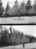 1989 Two photos of a man standing beside a flowering fruit tree.