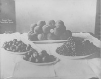 2001 "Idaho Fruit. Snake River Valley" Plates of peaches, plums, and grapes arranged on a table.