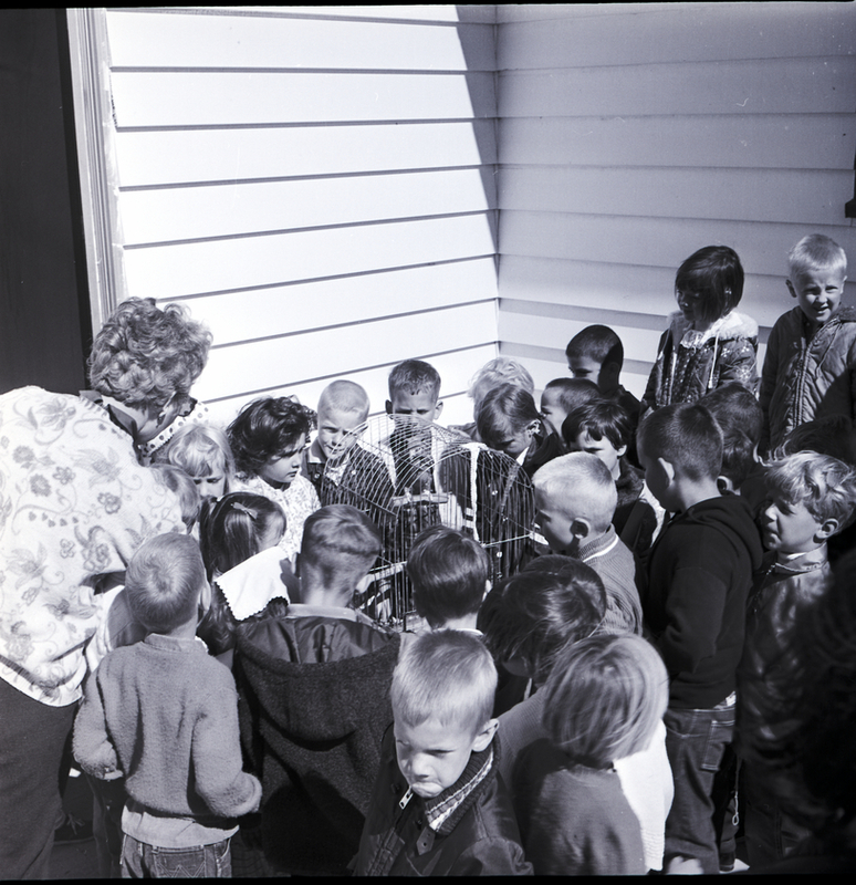 - Mrs. Cleo Shorthouse's kindergarten classes visit the Kenneth Walker farm. A group of children surround a birdcage, looking at the Quaker parrot shown by Mrs. Kenneth Walker. Behind them is a house.
