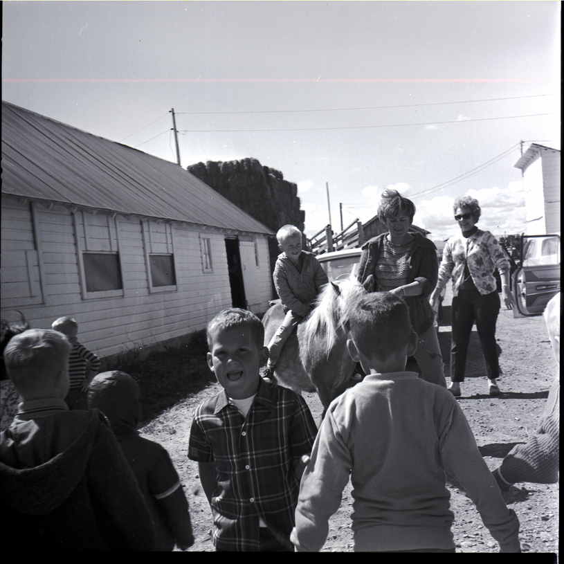 Mrs. Cleo Shorthouse's kindergarten classes visit the Kenneth Walker farm. A boy sits on top of a pony, and a woman assists him. Several children and Mrs. Kenneth Walker stand on the sidelines watching. To the left is a farmhouse, and in the background a barn and a large stack of baled hay are visible.