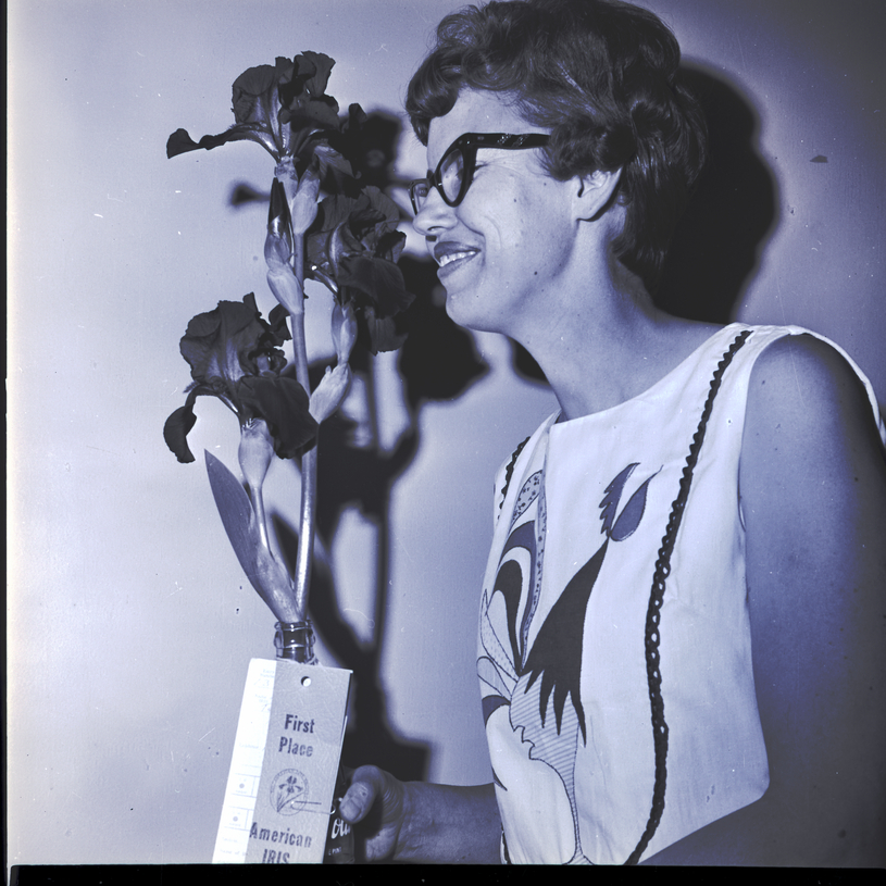 Mrs. Carl Crooks holds up a glass Coca-Cola bottle of irises titled "Tall Chief" at an iris show sponsored by the Magic Valley Iris Society and held at the Twin Falls YMYWCA. On the bottle is an award ribbon that reads "First Place American Iris Society."