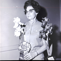 Mrs. Ed Conrad holds up a vase of light-colored irises at an iris show sponsored by the Magic Valley Iris Society and held at the Twin Falls YMYWCA. Mrs. Conrad was the second sweepstakes winner and received the AIS bronze medal certificate for second greatest number of cultural firsts. On the vase is the award ribbon from the Iris Society. On the table beside her is a vase of dark-colored irises.