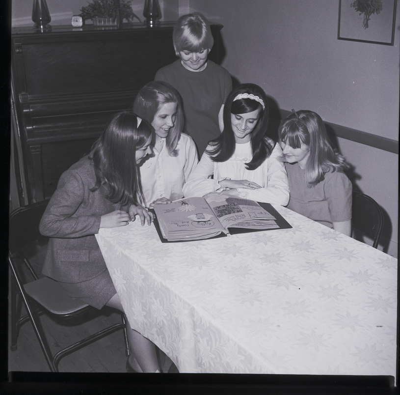 Attending Girls State at Northwest Nazarene College in Nampa, from Twin Falls, are from left to right, Susan Billington, Barbara Barker, Kathy Lincoln, Cynthia Ronk, and Paula Hawks. These girls were found outstanding in leadership, character, courage, honesty, scholarship, cooperativeness, and physical fitness by the Twin Falls High School faculty and the American Legion Auxiliary of Twin Falls. The five girls sit around a table looking at a scrapbook. The table is covered in a white tablecloth. Against the back wall is a piano. On top of the piano is a small clock, a centerpiece of a basket of silk flowers, and some lamps. A picture of a bouquet of flowers hangs on the side wall.
